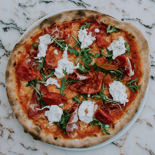 Tomatensaus, fior di latte, coppa di parma, rucola, burrata & semi zongedroogde tomaten